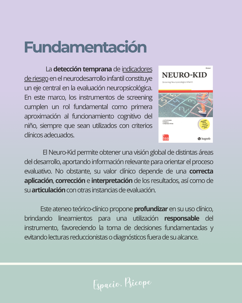 Este ateneo teórico-clínico propone profundizar en el uso clínico del Neuro-Kid, brindando lineamientos para una utilización responsable del instrumento, favoreciendo la toma de decisiones fundamentadas y evitando lecturas reduccionistas o diagnósticas fuera de su alcance.