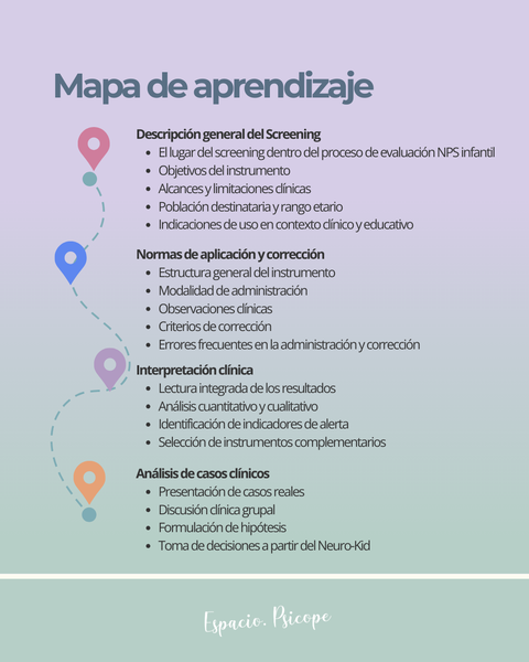 Criterios claros para aplicar, corregir e interpretar el Neuro-Kid, herramientas para leer los resultados con mirada clínica y lineamientos para tomar decisiones fundamentadas dentro del proceso de evaluación neuropsicológica infantil.